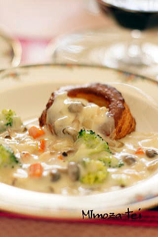 ポキ山先生がお喜びになるかしら…とクロワッサン生地でパイケースを作り、ホワイトシチューを掛けました。 先生に撮っていただくと本当に美味しそう! |