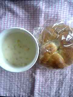 パン屋さんで買った“ぶどうパン”とさっき娘にねだられ作った“コーン増量スープ”(^◇^)