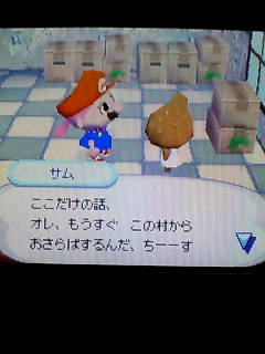 【おいでよどうぶつの森】《やきとり村》“サム”が引越すと言ったんですが、正直彼系のキャラは喋る時のといい、容赦といい私は見た目重視な、最悪高飛ビー女なんで超苦手キャラでさっさとしたいんですが、まだを頂いていなくなくなく引き止めました早くをくれぇ
