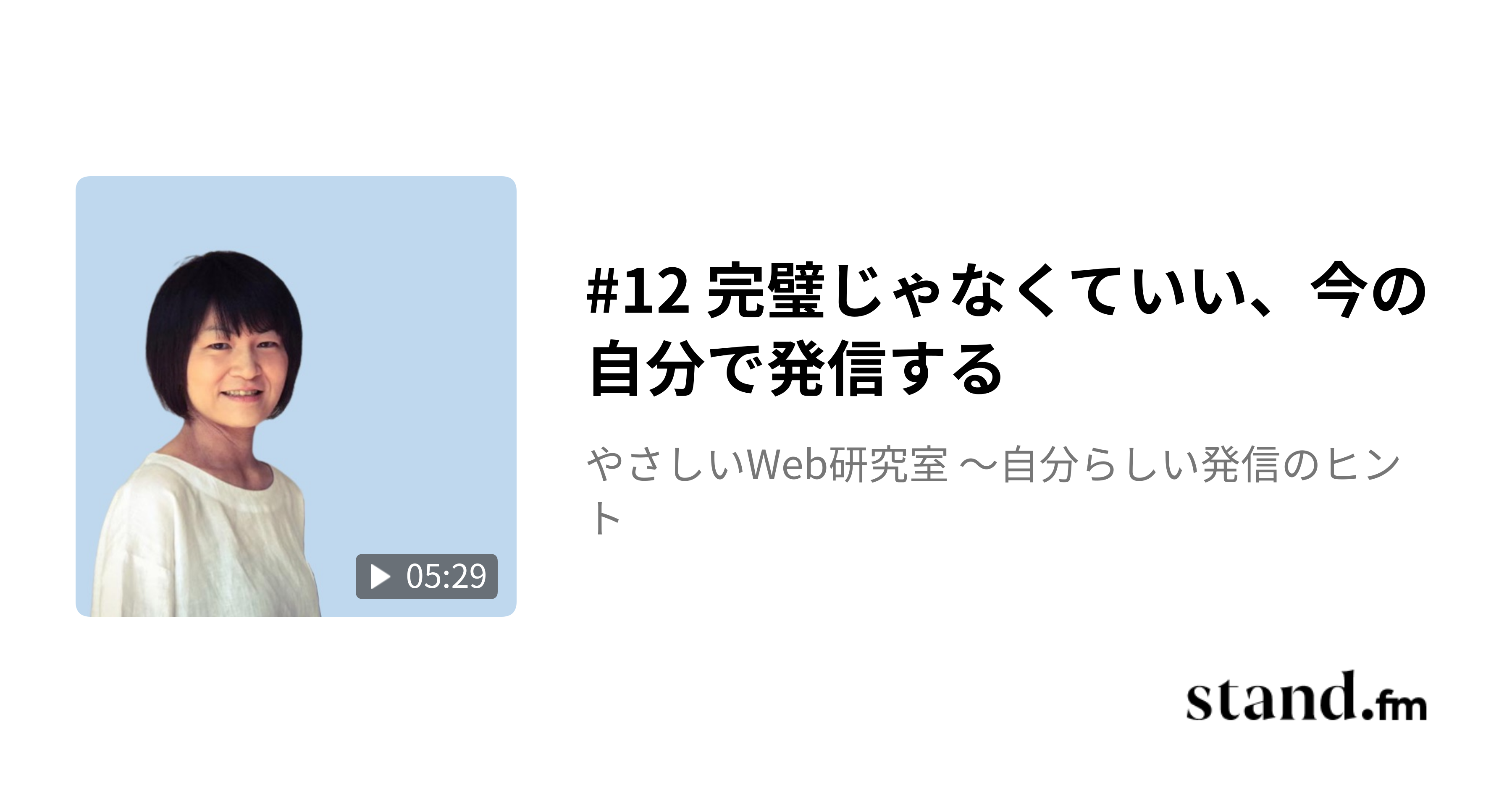 #12 完璧じゃなくていい、今の自分で発信する - やさしいWeb研究室 〜自分らしい発信のヒント | stand.fm最後まで聴いてくださりありがとうございます🤗 📒noteアカウント(スタエフの文字起こしメイン+α記事) https://note.com/minacle3 ✉️お問い合わせフォーム https://minacle-office.net/contact 🌷小さな想いをデジタルに、あなたの経験もコンテンツに。 …stand.fm