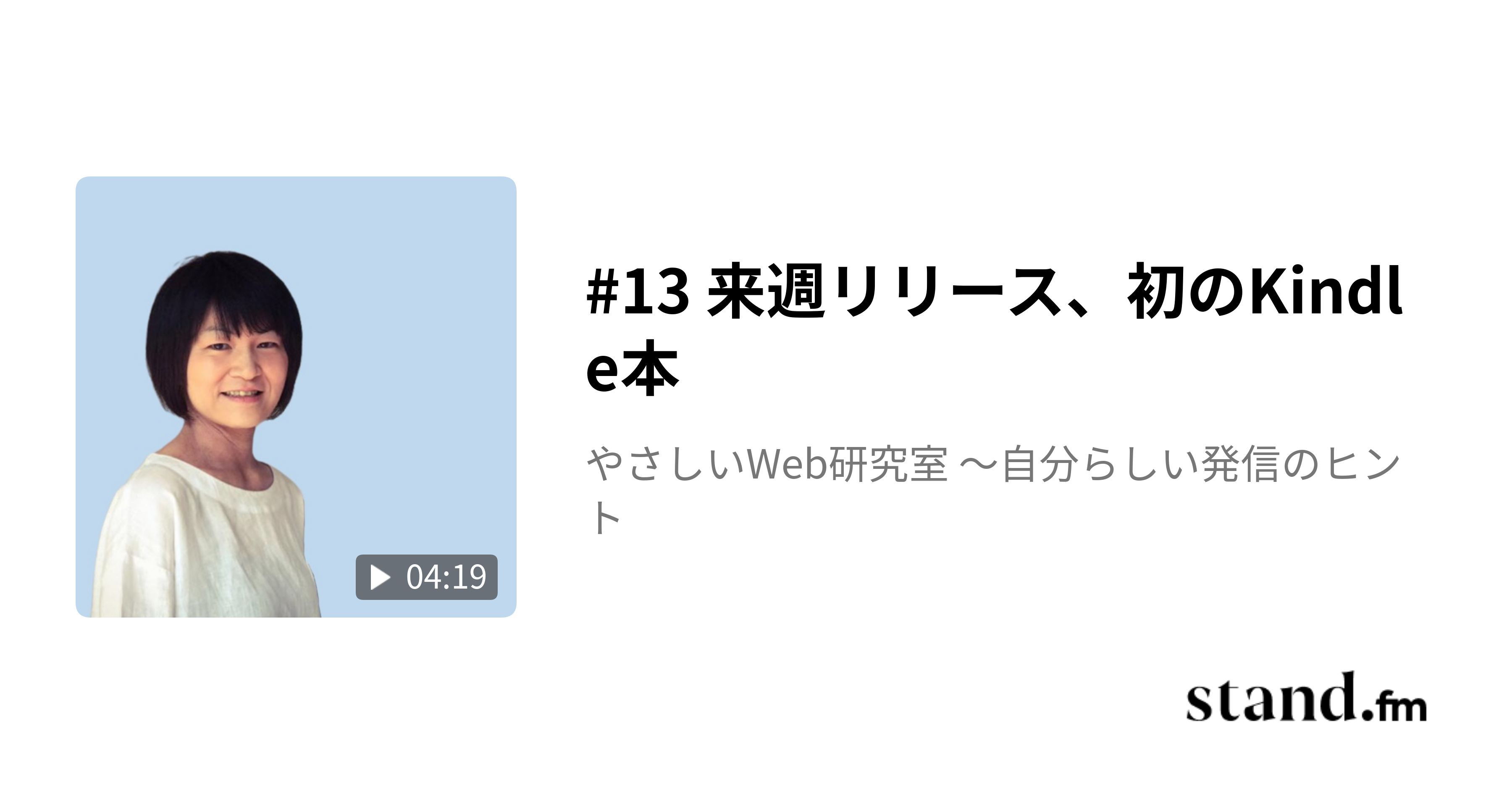 #13 来週リリース、初のKindle本 - やさしいWeb研究室 〜自分らしい発信のヒント | stand.fm最後まで聴いてくださりありがとうございます🤗 📒noteアカウント(スタエフの文字起こしメイン+α記事) https://note.com/minacle3 ✉️お問い合わせフォーム https://minacle-office.net/contact 🌷小さな想いをデジタルに、あなたの経験もコンテンツに。 🌷K…stand.fm