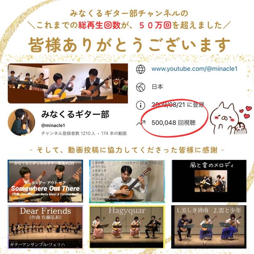 YouTubeチャンネルの総再生回数が、50万回を超えました♪【ありがとうございます🙏✨】みなくるギター部チャンネルをいつも聴いてくださっている皆様へ🤗クラシックギターが大好きで2015年から演奏動画🎸のアップを始めました🙌独奏も弾きますが、YouTubeにアップしているのは主にアンサンブル演奏です✨「みなくるとがっち」というデュオから、トリオ、カルテット、合奏動画まで♪YouTubeを通して、ギターという楽器の魅力やアンサンブルの楽しさが少しでも伝わったら嬉しい…♪🥰そして、ギター仲間さんとの演奏会や発表会での候補曲探しにもなれば…♪🤗(分かる範囲で使用楽譜も掲載しています♪)という想いで始めた動画投稿🎸ですが、この度、チャンネルの総再生回数が50万回を超えました🙏✨これまで一緒に動画に出演してくださった方々、いつも聴いてくださっている皆様への感謝の気持ちでいっぱいです🥹💕ありがとうございます✨🌈これからも楽しみに聴いていただけるようがんばりますので、引き続きどうぞよろしくお願いいたします🙌⬇️YouTubeコミュニティ投稿みなくるギター部 さんからの投稿【ありがとうございます🙏✨】 みなくるギター部チャンネルを いつも聴いてくださっている皆様へ🤗 クラシックギターが大好きで 2015年から 演奏動画🎸のアップを始めました🙌 独奏も弾きますが、 YouTubeにアップしているのは 主にアンサンブル演奏です✨ 「みなくるとがっち」というデュオから、 トリオ、カルテッ...youtube.com⬇️みなくるギター部チャンネルみなくるギター部クラシックギターが大好きで、2015年から演奏動画のアップを始めました。個人では独奏も弾きますが、YouTubeにアップしているのは主にアンサンブル演奏です。「みなくるとがっち」というデュオから、トリオ、カルテット、合奏動画まで♪楽しく一緒に弾いてくれる仲間に感謝しながら、少しずつ成長していけたらと思っています。各動画の説明欄には、使用した…youtube.com
