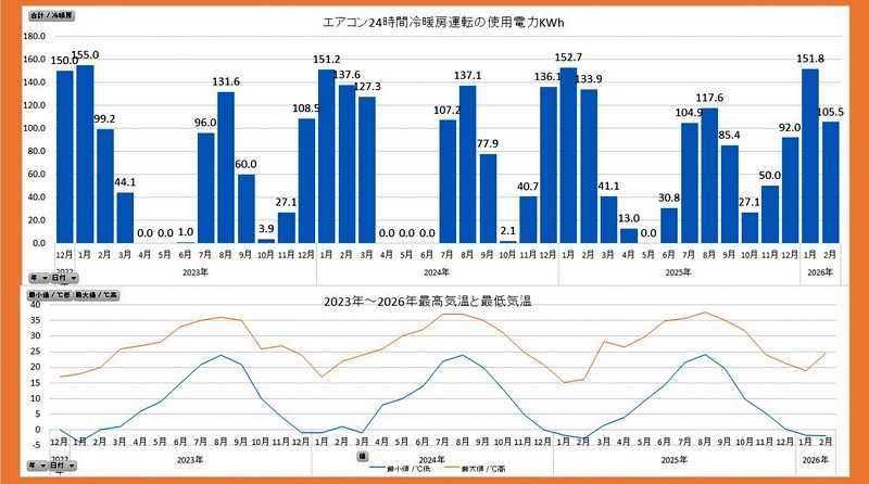 2025年10月に冷房が終わってそのまま暖房運転に切り替えましたからエアコンは去年の6月から休みなく動いています、暖房は20℃設定 風量自動です、室温は平均21.5℃湿度は40%前後で低めです