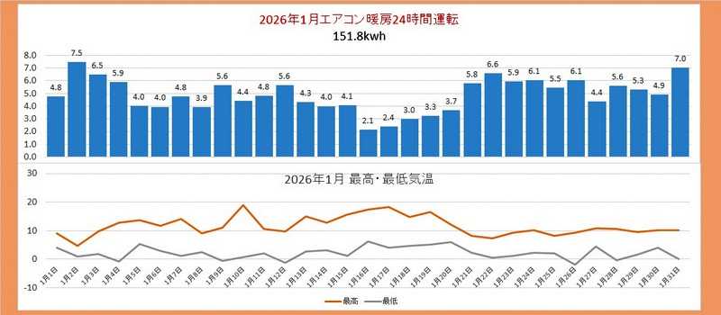 2026年1月の暖房運転費用は 151kwh×23.7円 =3,579円 115.4円/日