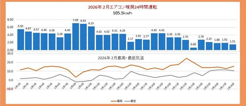 2026年2月の暖房運転費用は 106kwh×23.1円 =2,449円 87.5円/日