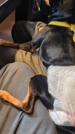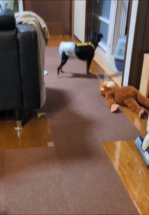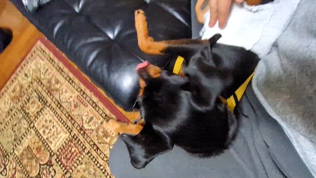 食い気味すぎるミニピン、今日の主役は豚の耳。