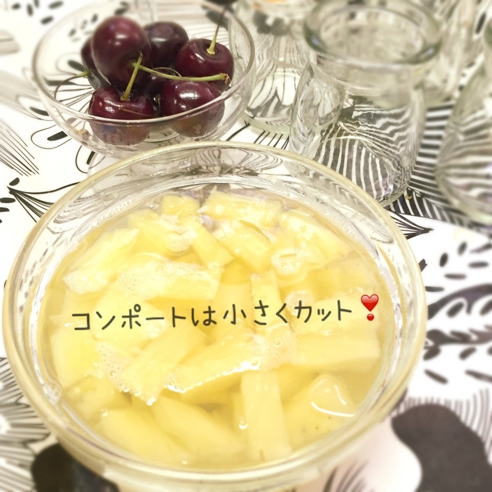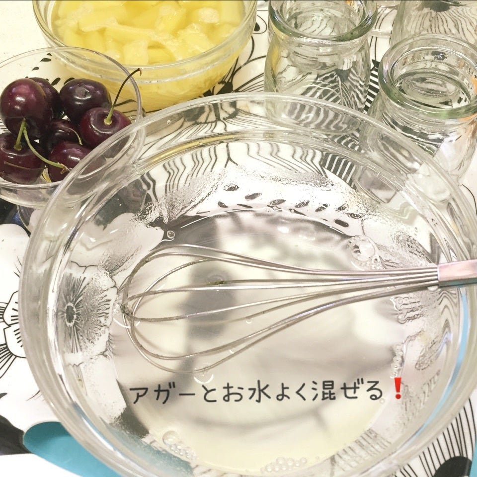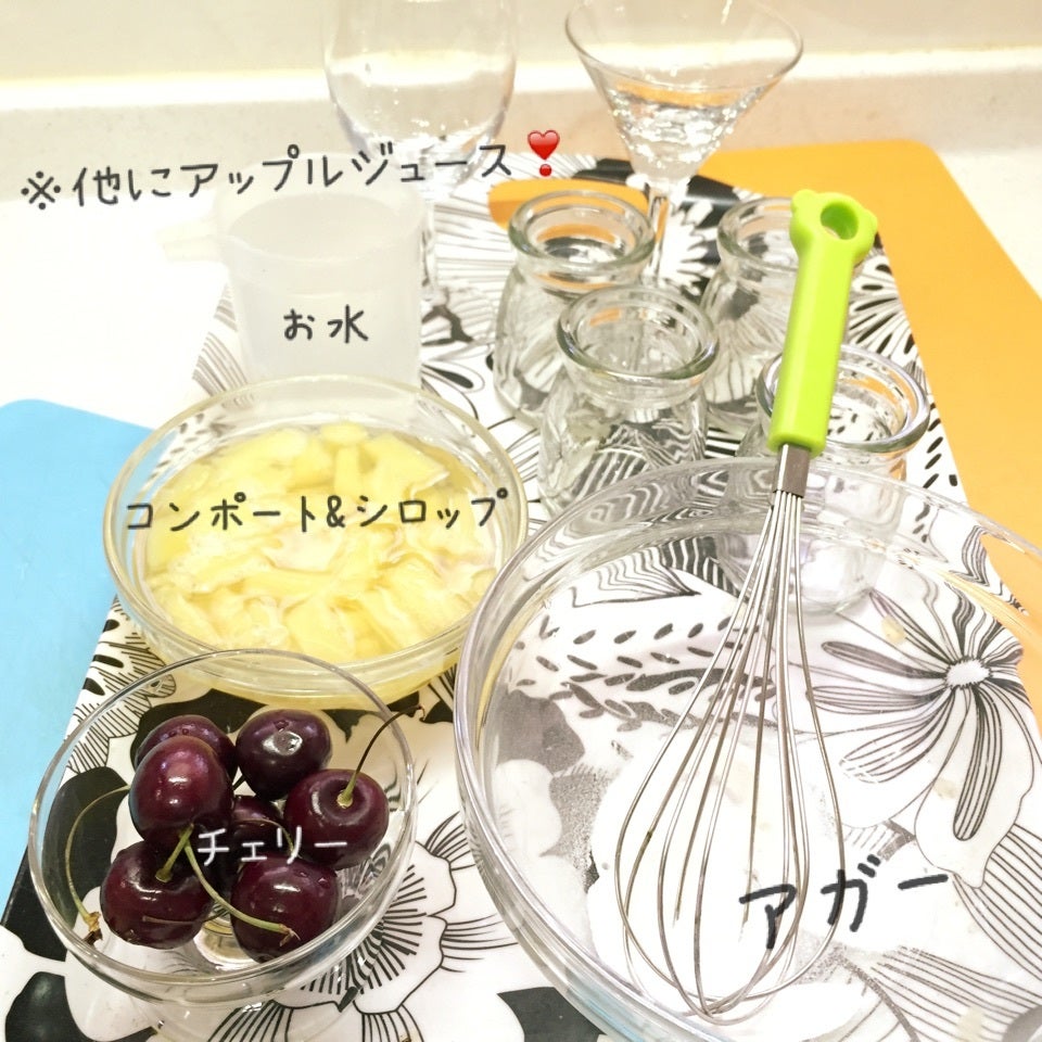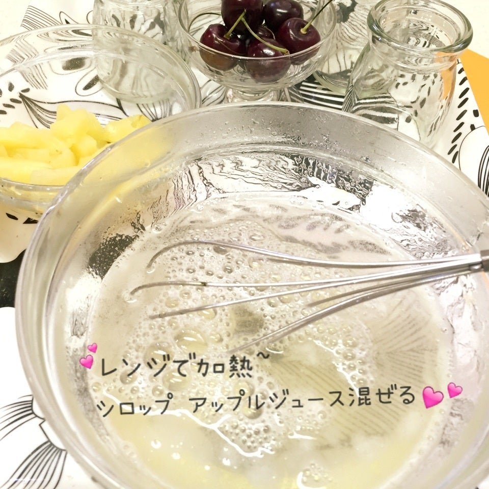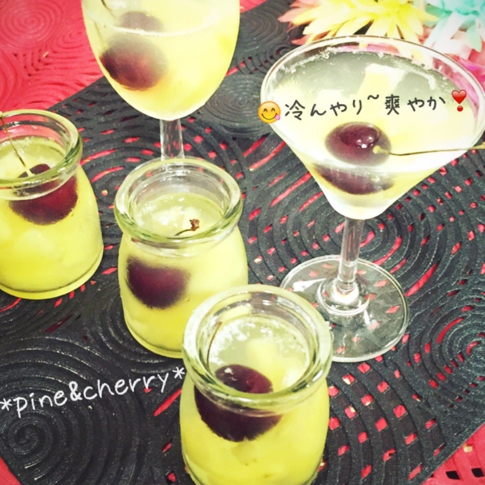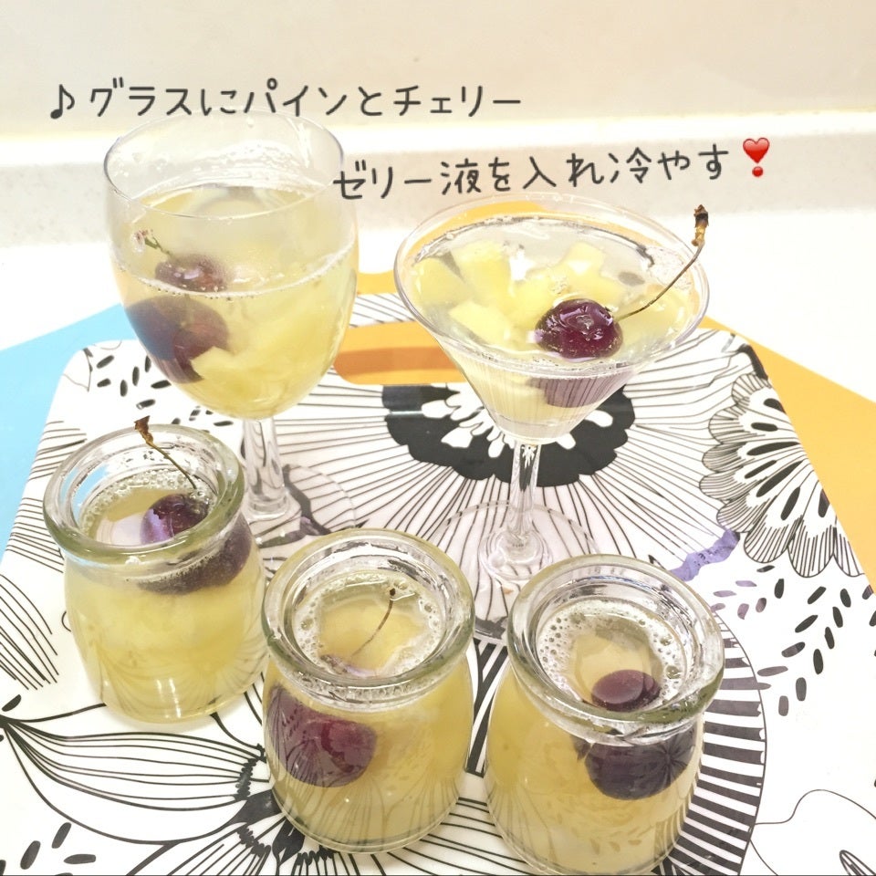 グラスにパインとチェリー入れ ゼリー液を注ぎ 冷蔵庫で冷やします❗️