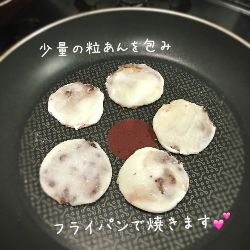 09白生地は1つ15gに丸め 少量の粒あんを包み フライパンで焼き上げます