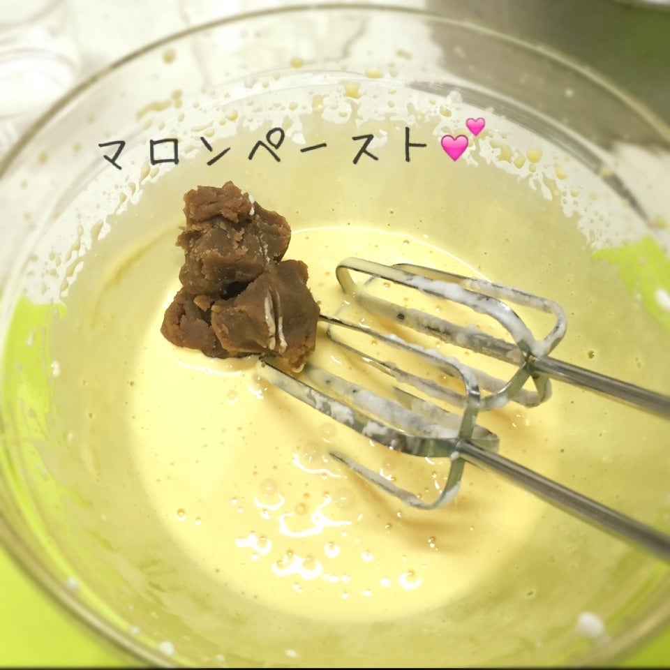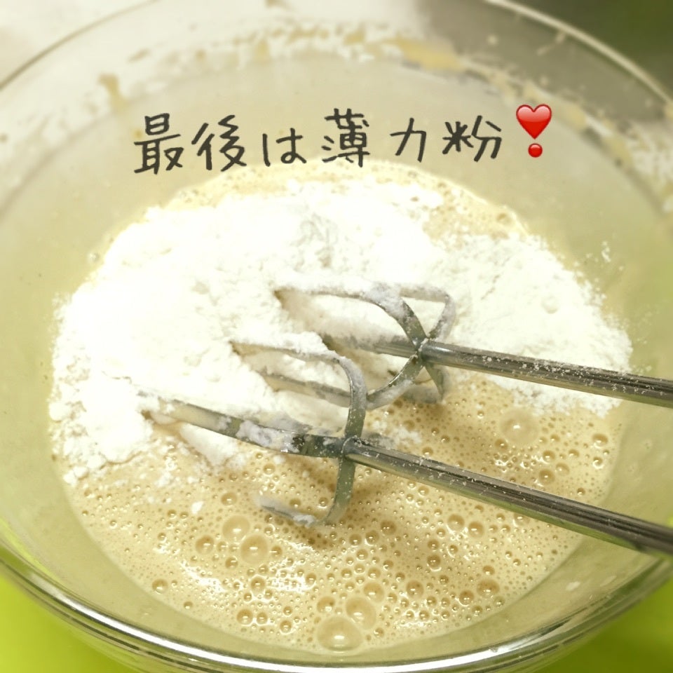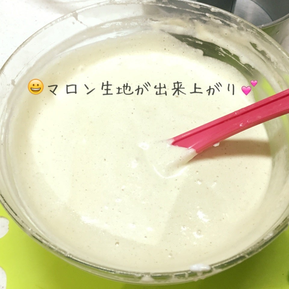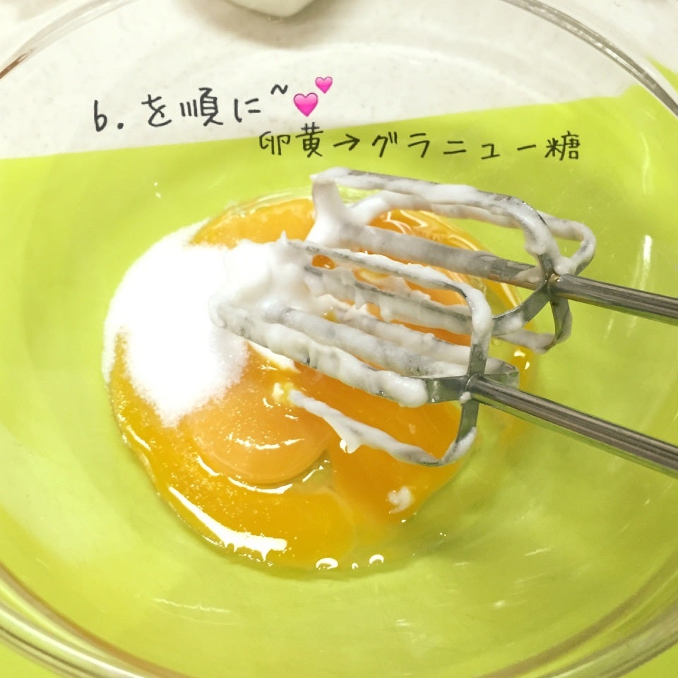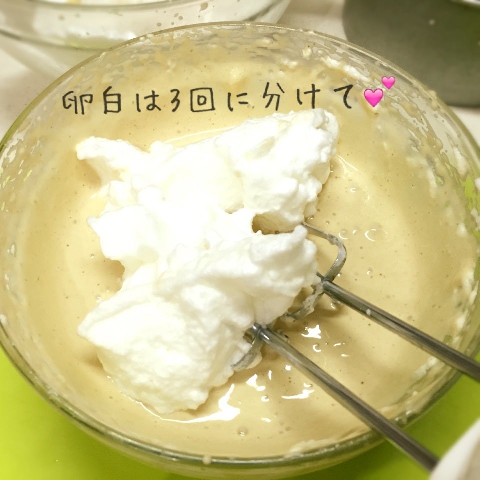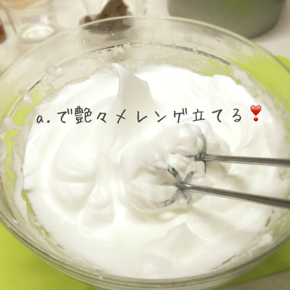 卵白に粗塩入れ グラニュー糖を3回に分け艶のあるメレンゲ立てます