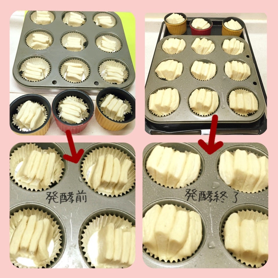 ▲本来は、1つのカップに3枚ずつ入れますが 今日は別のパンを一緒に焼いた為 天板の都合上4枚ずつ入れて焼きました。