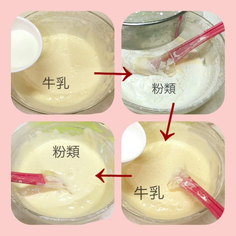 牛乳→粉類→牛乳→粉類の順にゴムベラで合わせる