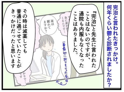 『うつ病完治』と言われたきっかけ : わたくしごとですが。 Powered by ライブドアブログ↑前回はこちら。アンサー漫画の続きです^ ^↓通院も服薬も卒業出来たのはこの辺り。最初の先生は、通院を卒業してからは一度も会っていません。(寿退社されたそうです^_^)『服薬と通院をなくす』ではなく、『内服しながらでも、元気に過ごせる』というところが私の着地点nakaema.blog.jp