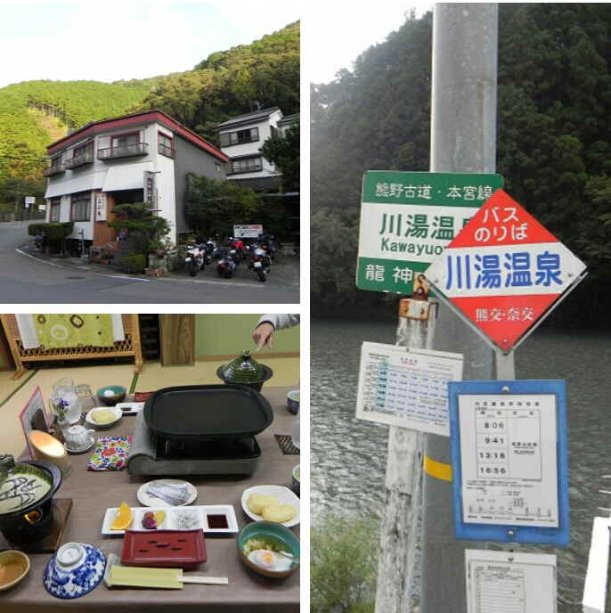 世界遺産 熊野ツーリング2日目 Part1 宿は3組み限定で、今回は我々だけの貸し切りである。貸し切りなので気楽に過ごせ、温泉と美味しい食事で快眠でき目覚めは良い! 朝は少し早く目覚め6時30分から内湯に入れる。10分はどフライング気味でお風呂に行くと、我々よりもフライングしたものがいる。しかし、内湯は2つあり貸し切りできる。もちろんかけ流しで気持ちいい(^_^)v 朝食は民宿と思えないぐらいの豪華さで、冷めた料理は皆無である。 宿泊料金は安くメンバー全員満足してくれたようである。 朝食を済ませ、世界遺産 熊野本宮大社に寄りR168を北上し谷瀬の吊り橋へ出発した!
