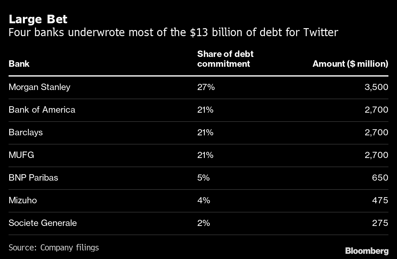 モルガンSとMUFGなど、損失5億ドル直面か-ツイッター買収支援モルガン・スタンレー率いる銀行団は4月時点では、資産家イーロン・マスク氏によるツイッター買収のための資金支援に乗り気だった。だが今は、マスク氏も銀行団も状況変化を切り抜ける明白な方法を持ち合わせない。www.bloomberg.co.jp