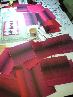 たのし~い一時これは 机でも 作業台でもなく絵の上です。今回はあまりに大きいので絵の上で色々やってます。そしてグラデーションの紙をめいっぱい広げて考えてる時、楽しいんです!ある程度決まると いよいよ オタクっぷりを発揮。切り続ける日々になります。