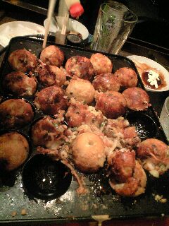たこ焼き?生まれて初めて作りました。これは たこ焼きです。真ん中あたり、お好み焼きの変形ではありません。一袋で約60個できるはずが40個しかできなかったけど(特大サイズだったみたい)たこ焼き作り、クセになりそう!