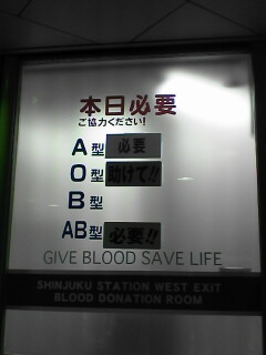 B型って・・・やっぱこんな所でも不人気なわけ??Aは『必要』 Oは『助けて!!』 ABは『必要!!』でも Bは 一応募集中~ みたいなこの表示。だって、だって、AB型の方が少ないのになぜBが最下位???とりあえず 必要! と付けておいてくれたら献血しようかな~ なんて思うけどな~意外とこういう所 気になっちゃうB型のワタシ。