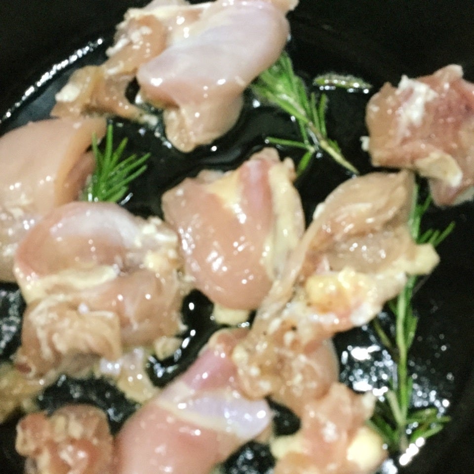 たっぷりのオリーブオイルに、ローズマリー3本で、香り移して、鶏肉焼きますよ〜〜😋😋😋