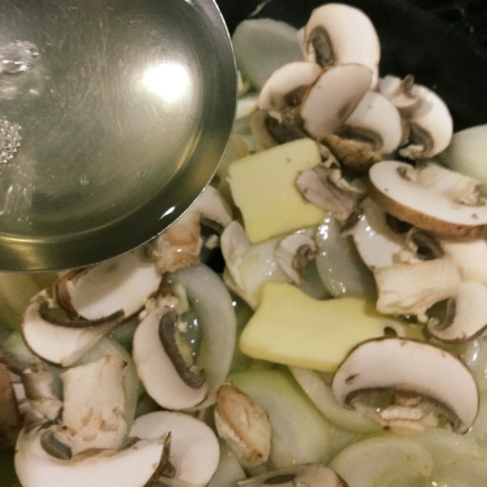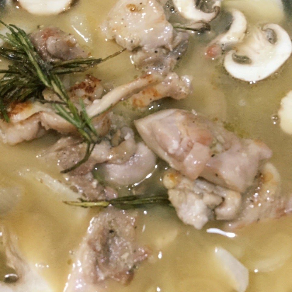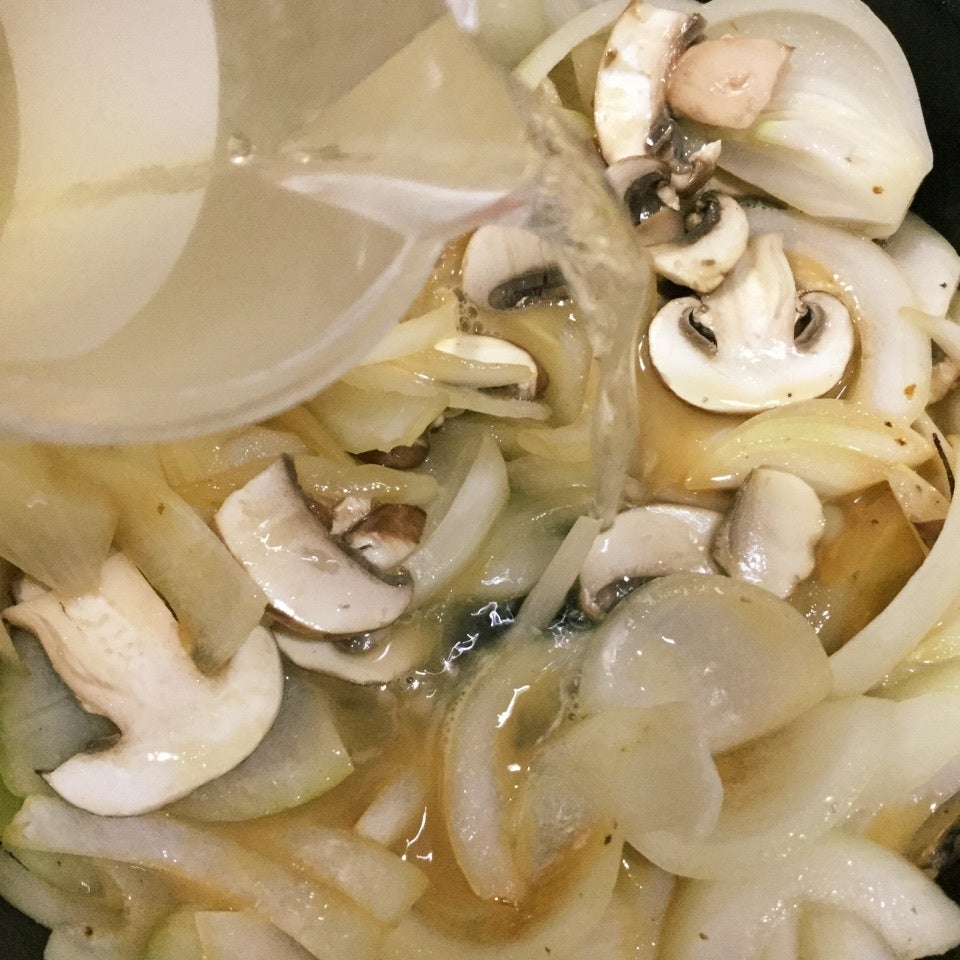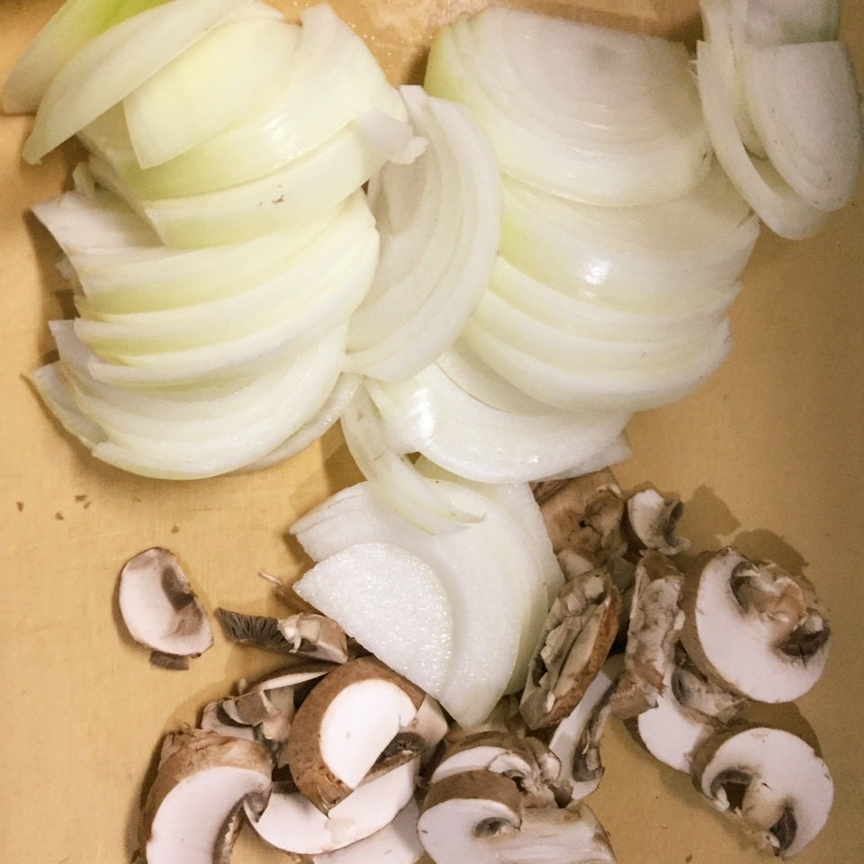 玉ねぎ一個スライス、ブラウンマッシュルーム🍄3個スライスを、鶏肉外して、焼いて