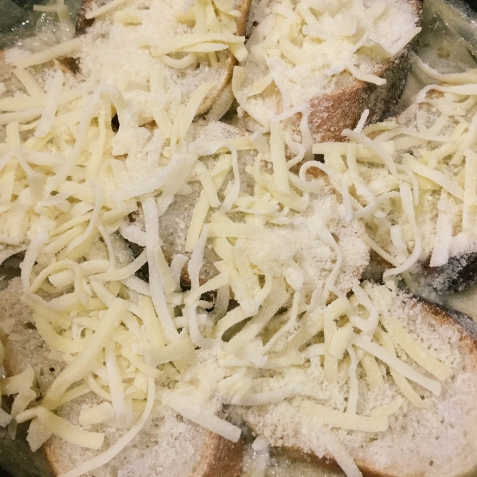 バケット乗せて、とろけるチーズ🧀パルメザンチーズ降って、オーブン230度で15分