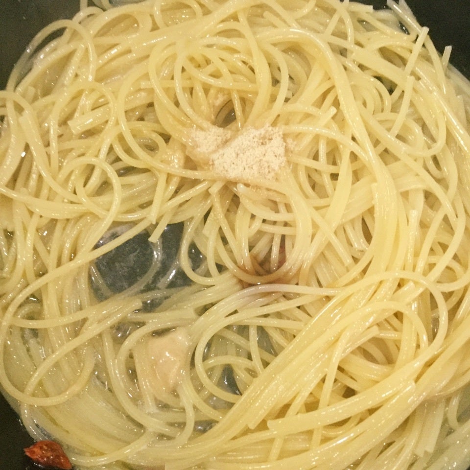 パスタ塩茹でのを時間より1分早めて、フライパンに