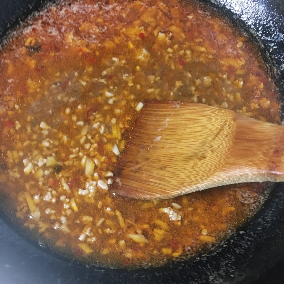 もう一度沸騰させて、糸唐辛子と山椒ふって