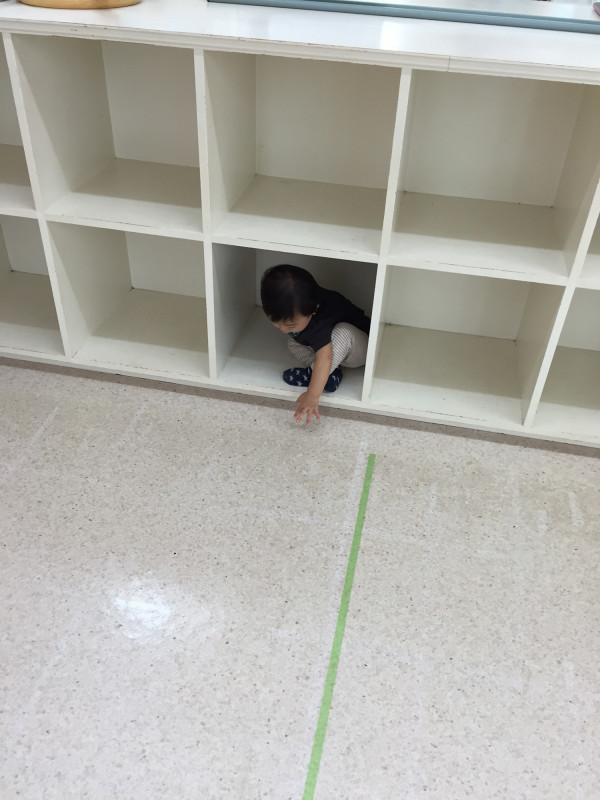 スタジオのロッカーに入って遊ぶ息子