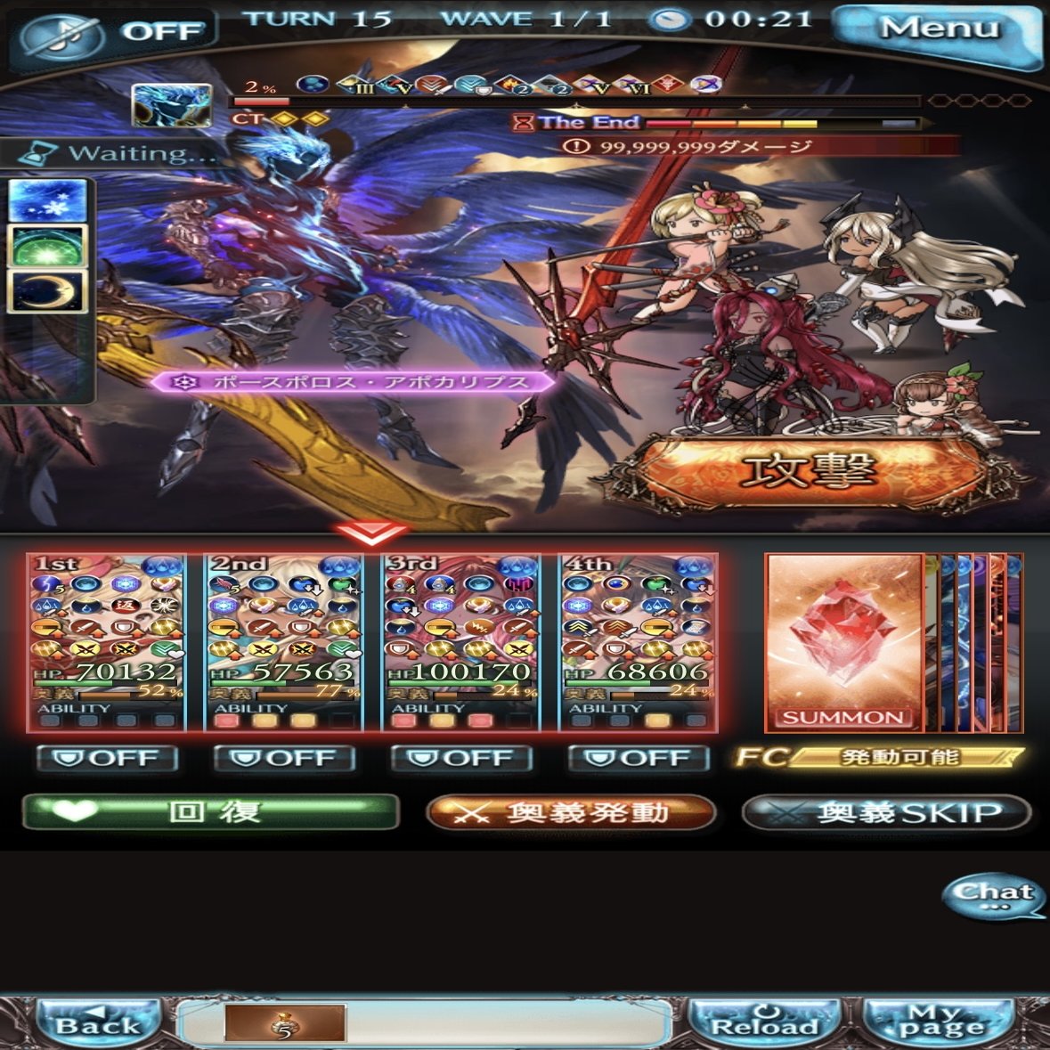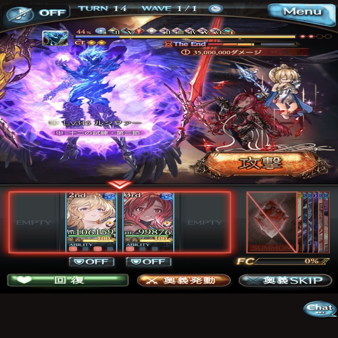 開幕ダメージを回復するためにルシ召喚。この時何でもいいから奥義系石と合体できるとうまあじ。絶対にアビポチする前に召喚すること。アンデッドがついてめんどくさいので。