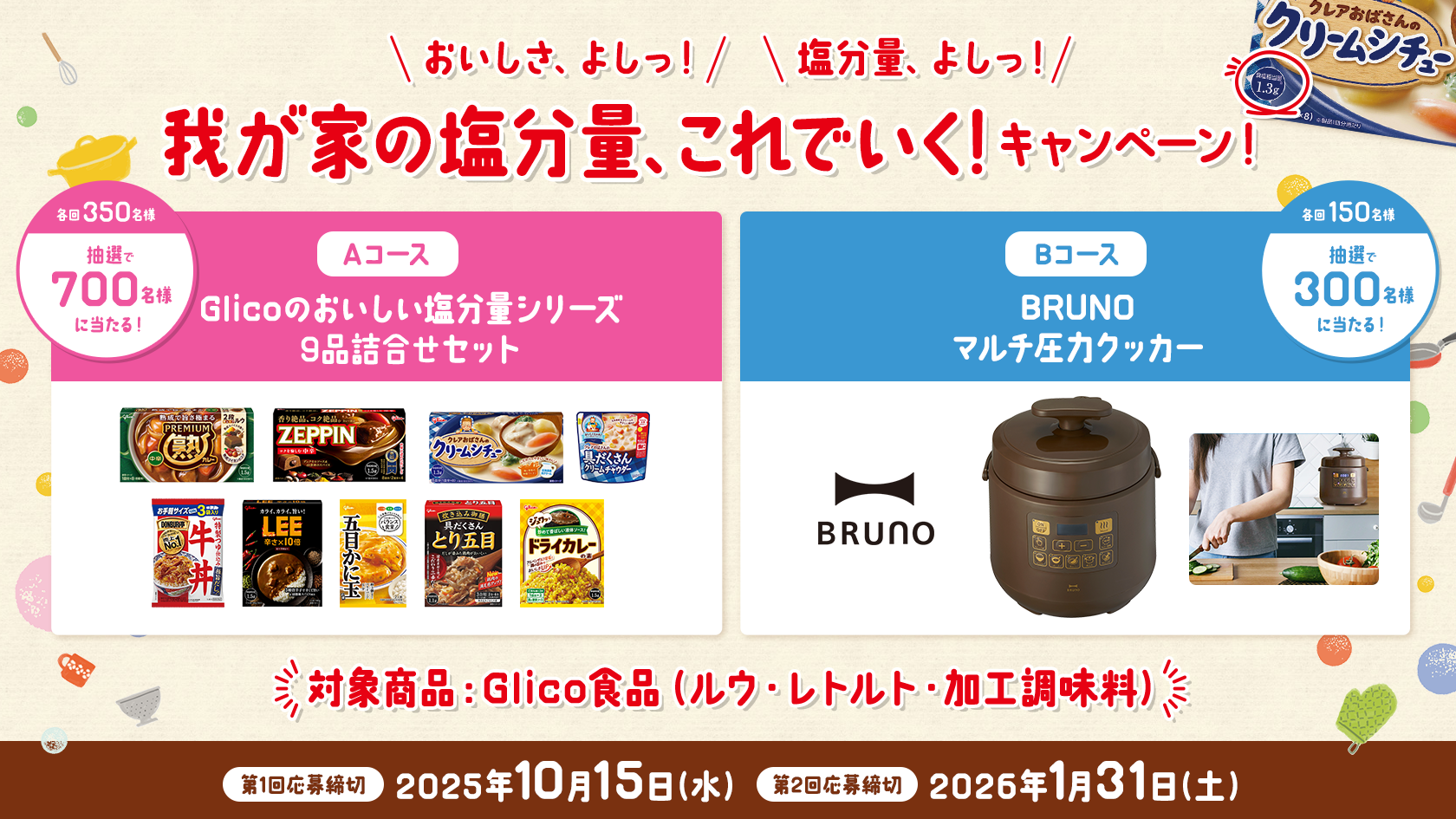 我が家の塩分量、これでいく!キャンペーン!|江崎グリコ【グリコ 我が家の塩分量これでいく!キャンペーン!】BRUNOのマルチ圧力クッカーなどを抽選で合計1,000名様にプレゼント!対象商品を購入したレシートで応募しよう♪2026年1月31日(土)23:59まで!cp.glico.com