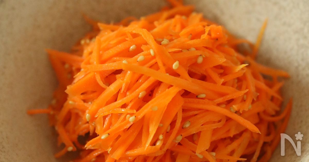 ↑要はニンジンをスライサーで細い千切りにして、水少しかけてレンジで3分30秒加熱して、調味料を混ぜるだけです。簡単!