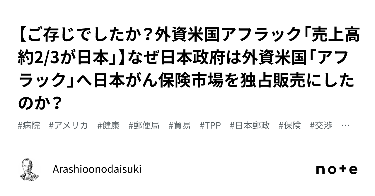 麻生財務相がTPPの事前交渉で「かんぽ生命からがん保険の申請が出ても認可しない」と米国に約束した日本側が、その後の交渉で「日本生命を外し、代わりにアフラックのがん保険を売らせる売国的譲歩」(保険業界関係者)に突き進んだ。