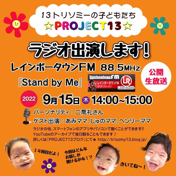 13トリソミーの子どもたちのお話に加えて、PROJECT13メンバーの3人が選んだ曲を4曲かけてもらえることになっています!