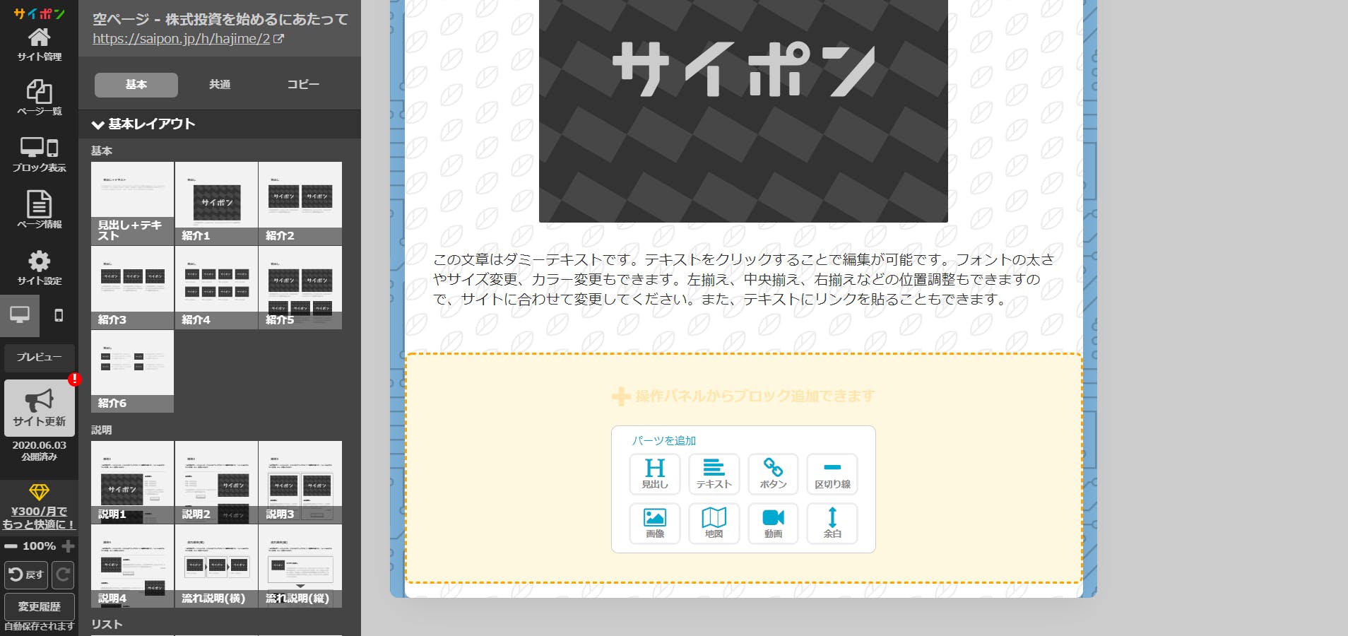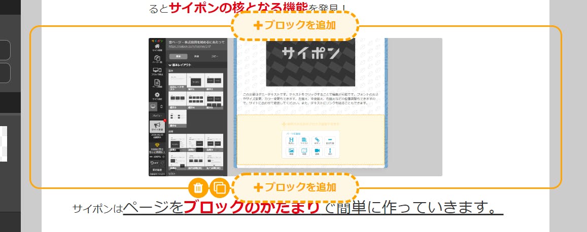 サイポンはページをブロックのかたまりで簡単に作っていきます。