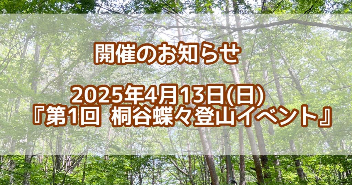 【お知らせ】登山イベントCheerCheer Daisyイベントのお知らせです!1年越しの登山イベントです!『第1回 桐谷蝶々登山イベント』〜初めての方向けハイキング〜◾️日時2025年4月13日(日)集合11:30出発11:45解散15:30予定◾️場所神奈川某所の低山(登り30分程度)みんなで山頂でピクニックしましょう🍙🌸初心者の方でも登れる山なので安心してください。※チケットの抽選申し込みは3/11までhttps://cheer.fanbox.cc/posts/9466357【全体公開】2025年4月13日(日) 『第1回 桐谷蝶々登山イベント』|桐谷蝶々 official fanclub|pixivFANBOXちあっすー!登山イベントやりますー! 2025年4月13日(日) 『第1回 桐谷蝶々登山イベント』 〜初めての方向けハイキング〜◾️日時2025年4月13日(日)集合11:30出発11:45解散15:30予定◾️場所神奈川某所の低山※登り30分程度、初めての方でも登れる山です。※詳しい行き先はCheerCheer D…cheer.fanbox.cc