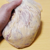 ビニール袋に、1のもも肉と、しょうがのしぼり汁、しょう油、砂糖、塩、卵を入れ、もみ込み、なじんだら、片栗粉を入れ、さらにもみ込みます。