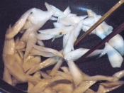 牛蒡は細切りやササガキや斜切り等、お好みの形・大きさに切っておく。(私は今回、大きめのササガキ)