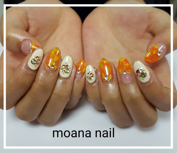 ジェルでオレンジのマーブルとストーンでビジューアートです♪