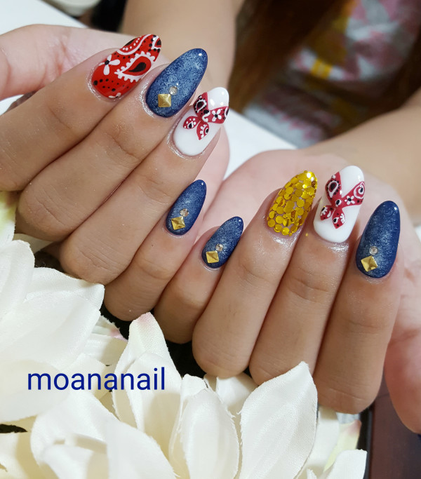 流行りのバンダナ柄とデニム柄のジェルネイルです♡