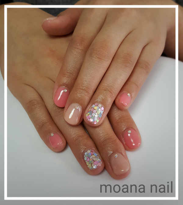 ピンク&ベージュのジェルです!パステルカラーのホログラムがキラキラしてかわいいデザインです♥