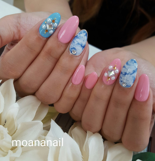 ベースはワンカラーorラメグラ、アートはサンプルからマーブルとビジューを選択していただきました♥