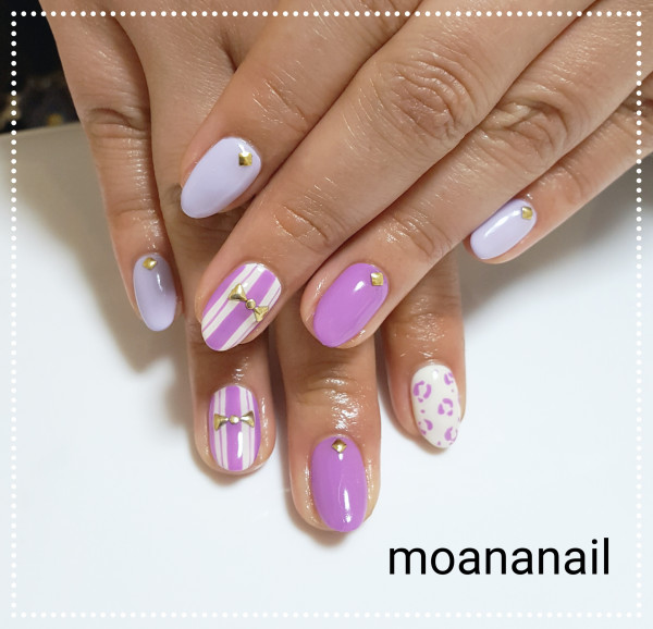 パープルのジェルネイル♪ストライプとヒョウ柄が入っています♪リボンもかわいいですね♪