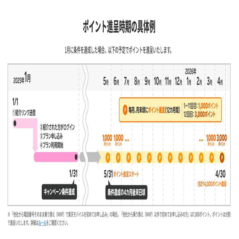 →2024年から進呈時期が変更。4ヶ月後から1年間かけてポイント付与が行われてくぞ!1年後には満額の14,000ポイント(もしくは7000ポイント)が獲得完了だ!