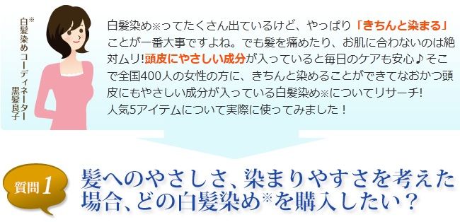 30代~60代女性★400人が選らんだ【白髪染め】 ランキング! まず、白髪染めコーディネーター 黒髪良子って誰って感じですが... ランキング行ってみますか 第1位は こちら 第2位は こちら 第3位は こちら 第4位は こちら 第5位は こちら