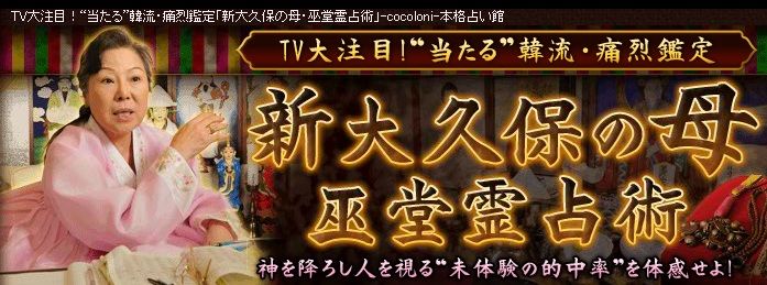 TV大注目!【新大久保の母 】韓国の母★当たる韓流・痛烈鑑定「巫堂霊占術」 今テレビや雑誌で 注目を浴びている 強烈なキャラクターの持ち主 新大久保の母【妙月】 今までに結婚、離婚、中絶、 娘との別れ、大病にかかり、 人生の苦悩を経験している 韓国の人間国宝である 巫堂師匠の元で 長い時間修行を積んできた 日本ではたった 1人しかいない大物「巫堂」 詳細は ↓ こちらから