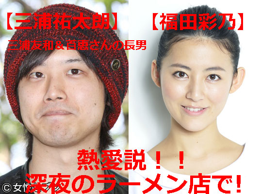 百恵さん長男【三浦祐太朗】と【福田彩乃】熱愛説!!深夜のラーメン店でキャッチ! 深夜1時半過ぎにもかかわらず 大勢の客でごった返す 東京・渋谷の人気ラーメン店 2月中旬、この店に関係者数名 とともにやってきたのは 吉高由里子、ローラ、長澤まさみ YOUらのものまねで大人気の 福田彩乃(26才)だ 真相はこちら ↓ クリック