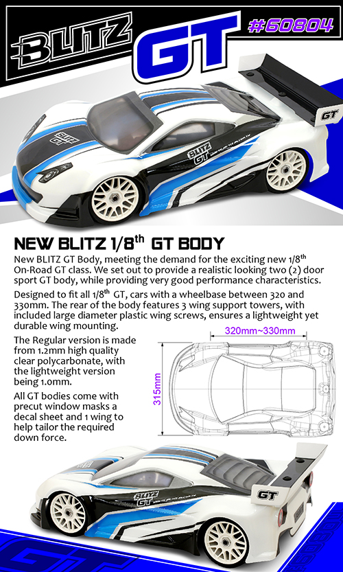 BLITZ ボディ入荷です☆ 待望の、1/8GTボディ、 TITAN より到着しました 60804 BLITZ 1/8GTボディセット トシゾー店長、大絶賛です! とにかく カッコイイのです。 1.0mm と 1.5mm 厚をご用意。 店頭でチェックされてくださいね