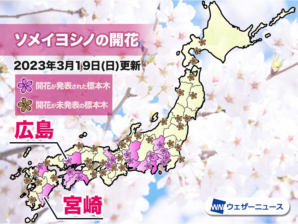 広島で桜開花 平年より6日早い 中国地方で開花トップ今日3月19日(日)、広島地方気象台から桜の開花が発表されました。平年より6日早く、昨年より2日早い観測で、中国地方ではトップの開花発表となります。 宮崎地方気象台からも発表があり、平年より4日早く、昨年より1日遅い開花となりました。今日は大阪、静岡に続いての発表となりました。weathernews.jp