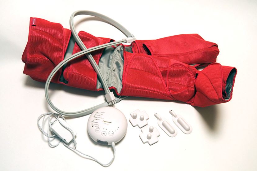 コントローラー兼、空気を送り出す本体のほか、足に巻き付けるアタッチメント、マッサージの補助をするパッドなどが付属する