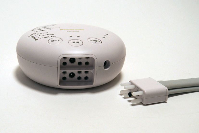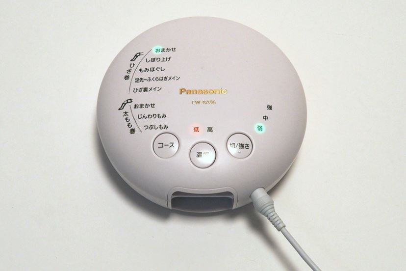マッサージャーというと、揉み玉で筋肉をゴロゴロ刺激するものが多いですが、EW-RA96は「空気圧」で肉を絞るタイプの製品です。マジックテープで足にピッタリと太いベルト状のアタッチメントを巻き付けると、このアタッチメント内に空気を送り込んで足全体を「絞り上げる」仕組みです。アタッチメントは足先から太ももまでカバーしており、左右6エリアずつにエアーバッグを内蔵。このエアーバッグが足先、かかと、足首、すね、ふくらはぎ……と、足に順番に圧力をかけることで、筋肉の疲れをとったり、足の血行を促進するのです。