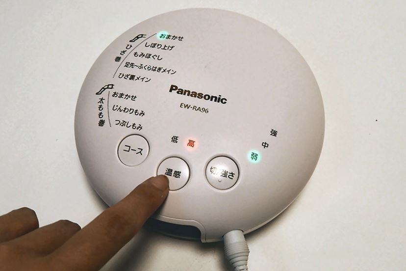 ヒーターは「低」で約37℃、「高」で約40℃。高は裸足で使用すると熱すぎると感じる温度。アタッチメント内部は抗菌素材ですが、靴下などは履いたほうがよさそう。ちなみに、ヒーターは土踏まずの先から足先までしか内蔵されていませんが、使用後は足湯のように身体中がポカポカと温まりました。もちろん暑い日などはヒーターを切ることも可能